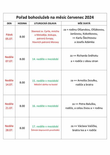 Pořad bohoslužeb na měsíc červenec 2024
